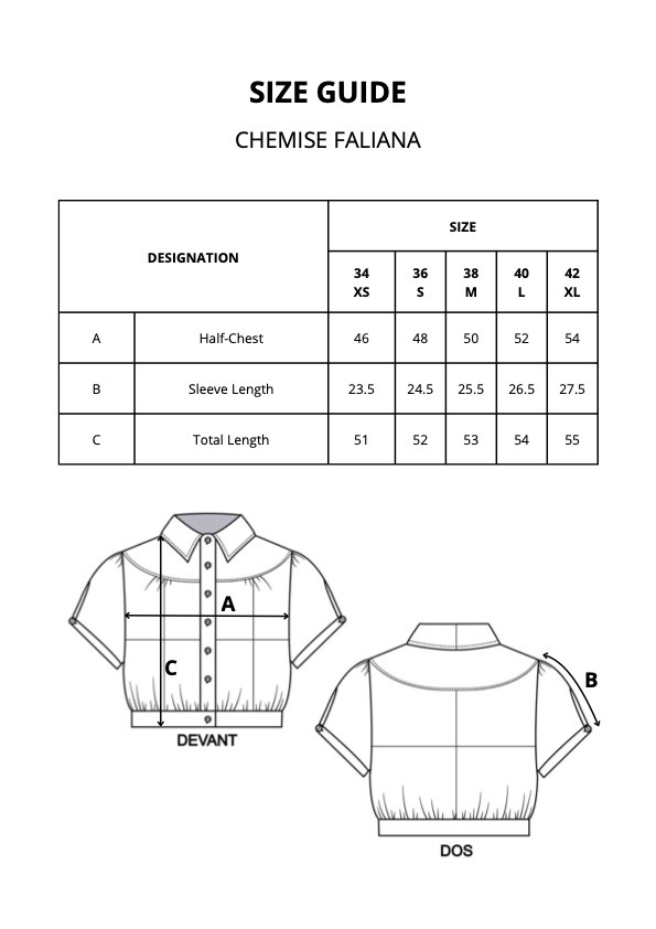 The Faliana Shirt stands out for its timeless style and delicate details. Its short balloon sleeves, adorned with small buttons, add a playful and feminine touch, while the square cut-outs and rounded chest detail—inspired by western shirts—introduce a hint of originality.
